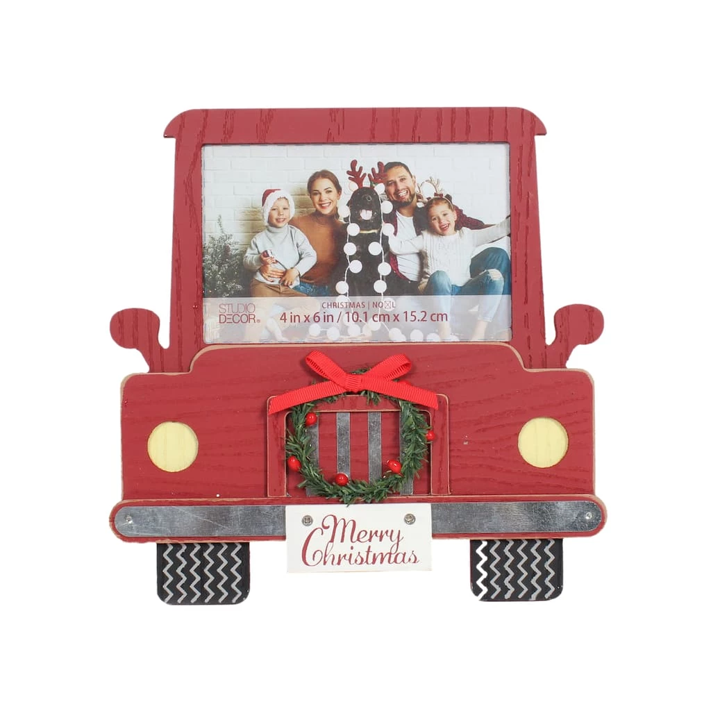 Display a photo within this festive red truck frame. It features a mini wreath and a “Merry Christmas” decorative licence plate.