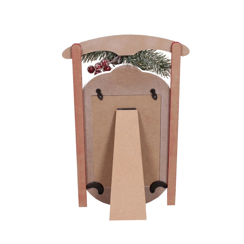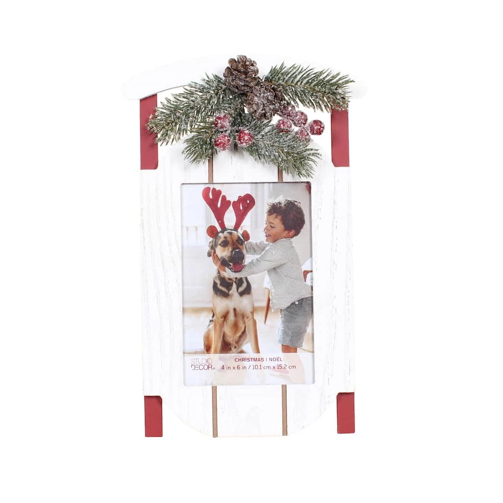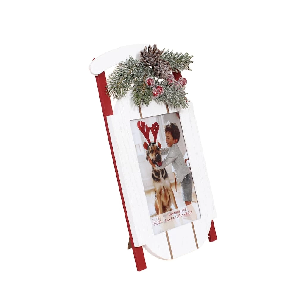 Display a photo within this festive white sleigh frame. Accented with faux pine, berries and mini pinecones.